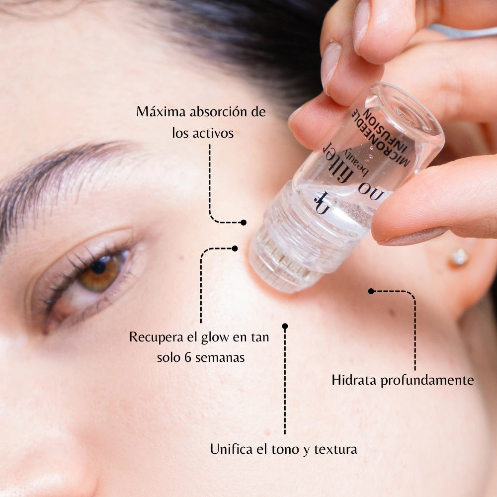 A diferencia de las cremas tradicionales que se quedan en la superficie, nuestro sistema de micro-infusión utiliza micro-agujas ultra finas de grado médico por estampación, diseñadas para abrir de manera segura e indolora cientos de micro-canales temporales en tu piel.